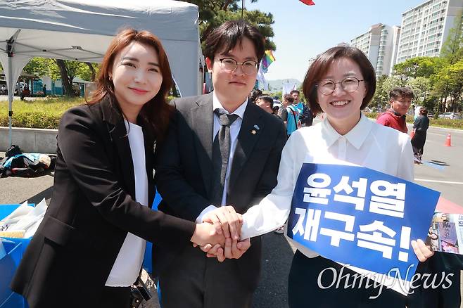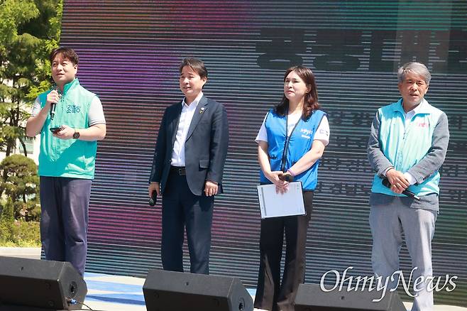 | ▲ 4월 26일 오후 창원운동장 만남의광장 앞 도로에서 “내란완전종식, 민주헌정 수호, 새로운 대한민국 건설, 경남 야4당 공동행동”에 이어 “내란세력 완전청산, 사회대개혁 실현 경남도민대회”가 열렸다. 사진 오른쪽부터 정혜경 국회의원과 진형익-이원주 창원시의원. |
