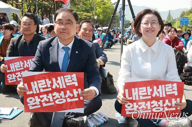 | ▲ 4월 26일 오후 창원운동장 만남의광장 앞 도로에서 “내란완전종식, 민주헌정 수호, 새로운 대한민국 건설, 경남 야4당 공동행동”에 이어 “내란세력 완전청산, 사회대개혁 실현 경남도민대회”가 열렸다. 허성무, 정혜경 국회의원. |