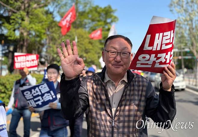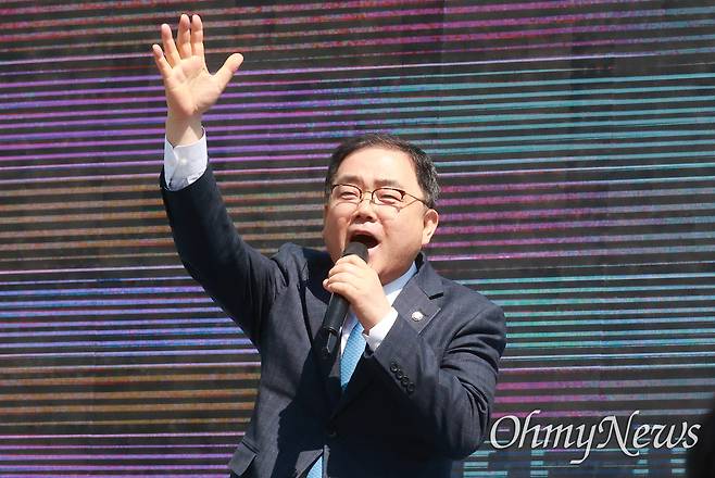 | ▲ 4월 26일 오후 창원운동장 만남의광장 앞 도로에서 “내란완전종식, 민주헌정 수호, 새로운 대한민국 건설, 경남 야4당 공동행동”에 이어 “내란세력 완전청산, 사회대개혁 실현 경남도민대회”가 열렸다. 허성무 국회의원. |