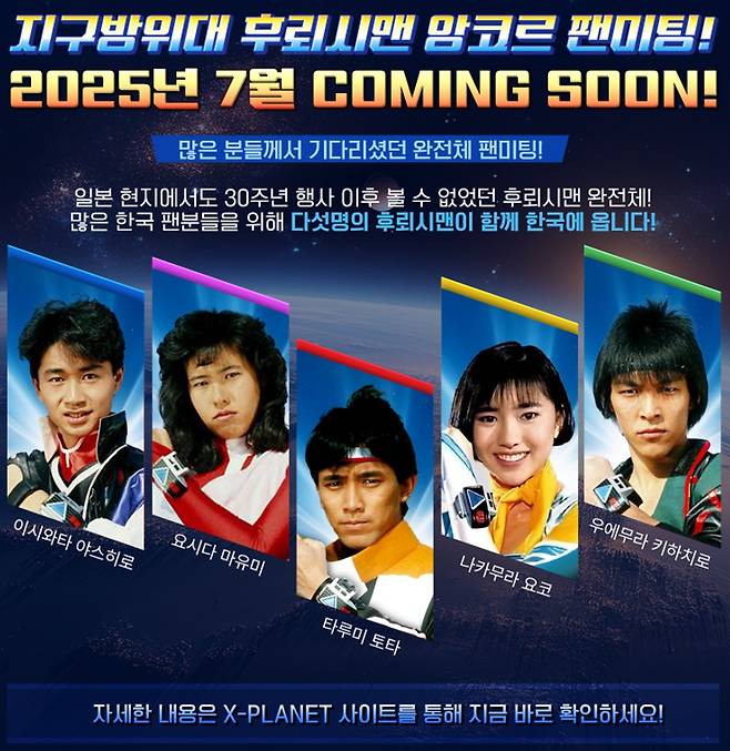컴투스홀딩스의 자회사 컴투스플랫폼은 지난 25일 NFT 마켓플레이스 엑스플래닛(X-PLANET)을 통해 '초신성 플래시맨(한국명 지구방위대 후뢰시맨)' 멤버 5명(타루미 토타, 우에무라 키하치로, 이시와타 야스히로, 나카무라 요코, 요시다 마유미)이 오는 7월 한국에서 팬미팅을 진행한다고 밝혔다.