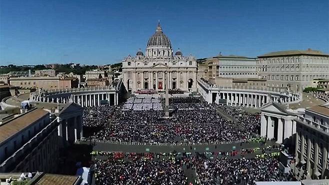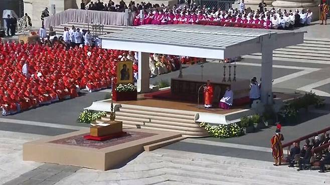 네, 제 뒤편으로 장례미사 장소인 성 베드로 광장이 보이실 텐데요, 교황의 관은 현재 교황이 직접 선택한 안식처인 로마 시내의 산타 마리아 마조레 대성당 쪽으로 운구가 시작됐습니다.