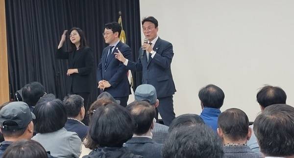 "제가 지난주에 부활절 연합 예배를 강남에 있는 한 교회에서 했는데, 맨 앞자리에 세 명이 앉았다. 제가 앉고, 그 옆에 국민의힘 권영세 비대위 위원장이 앉고, 그 옆에 권성동 원내대표가 앉았다. 바로 그 전날이 민주당이 충청도에서 경선을 하는 날이었다.