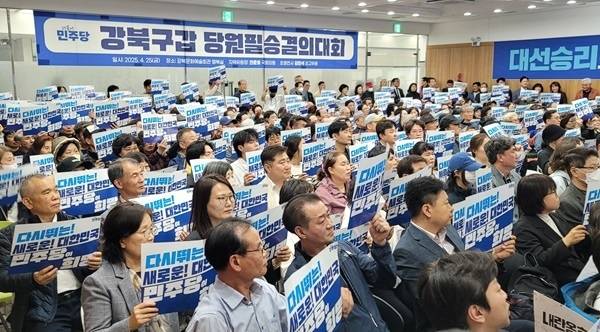 | ▲ 서울 강북갑 지역위원회 당원대회 서울 강북갑 당원대회 참가한 당원들이 손팻말을 들고 있다. |