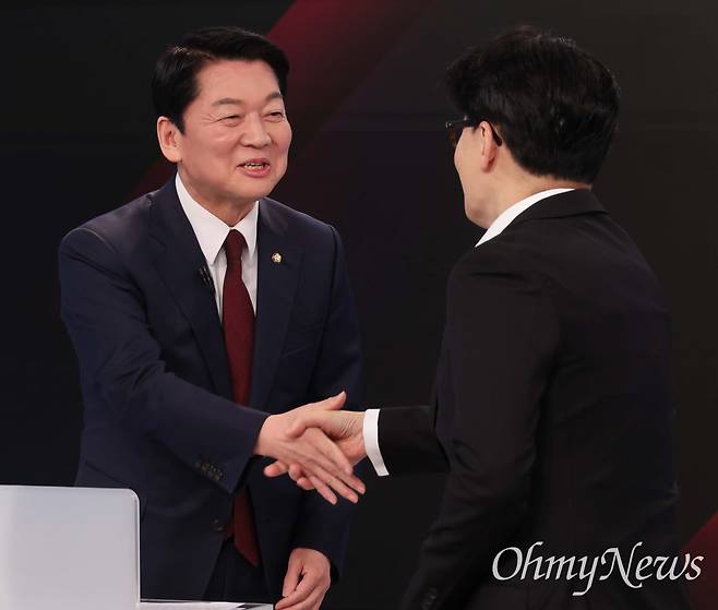 | ▲ 26일 서울 중구 매경미디어센터에서 열린 국민의힘 대통령 선거 제2차 경선 후보자 토론회에서 안철수-한동훈 후보가 인사를 나누고 있다. |
