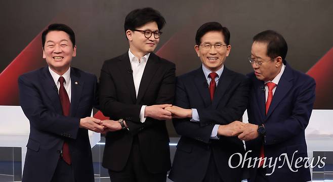 | ▲ 26일 서울 중구 매경미디어센터에서 열린 국민의힘 대통령 선거 제2차 경선 후보자 토론회에서 후보들이 기념 촬영을 위해 손을 맞잡고 있다. 왼쪽부터 안철수, 한동훈, 김문수, 홍준표 후보. |
