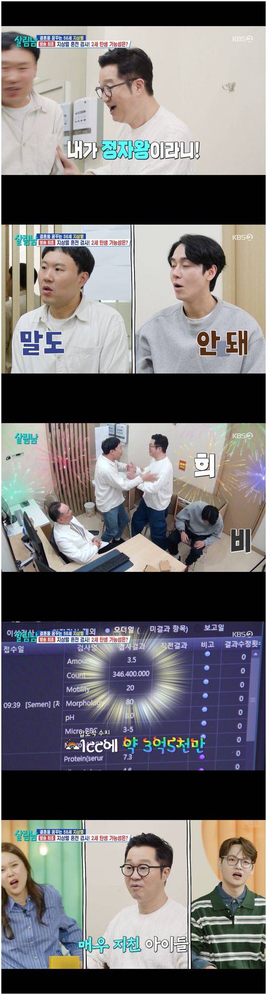 정자 수 2만5천 마리를 기록했던 김상혁은 현저히 줄어들었다. 전문의는 “양이 약간 적었는데, 정자 수 카운트도 좋다. 정상 기준은 1cc에 2천만 마리에, 양은 2cc면 정상으로 본다. 운동성과 형태도 정상이다. 2세 계획에도 지장이 없다”라면서 “좀 더 나올 얘기가 있다. 1cc 당 3,490만 마리다. 여기서도 김용명이 이겼다”라며 김상혁을 좌절하게 만들었다. 이에 은지원은 “쟤는 이혼뿐 아니라, 사기까지 당해서 그렇다”라며 혀를 끌끌 찼다.