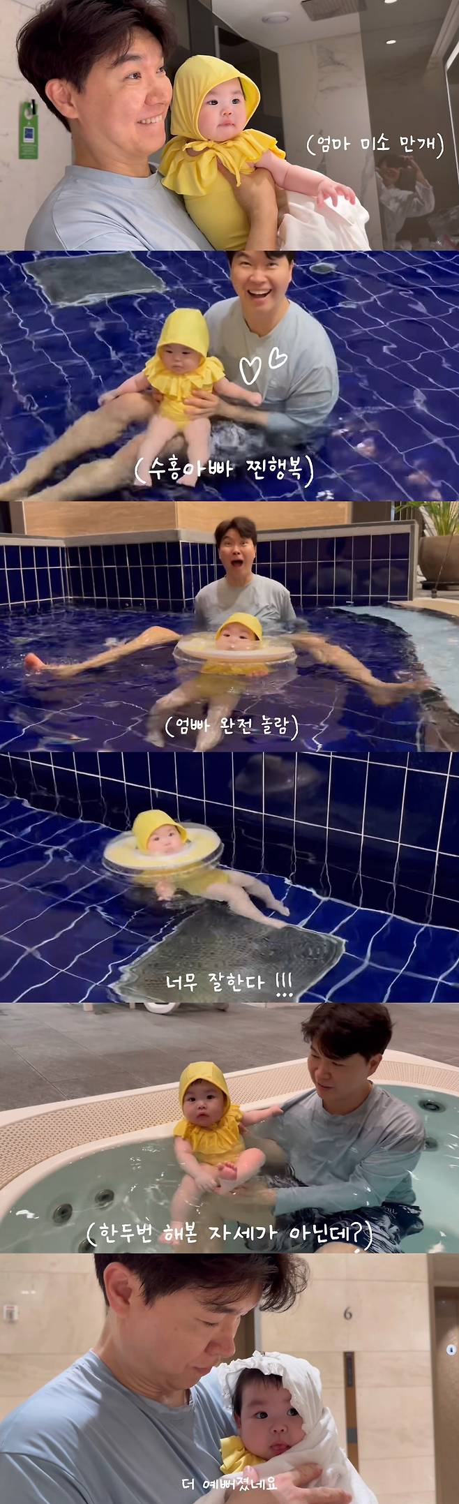 영상에서 박수홍과 김다예는 생후 6개월 된 딸 재이를 데리고 수영장을 찾았다. 노란색 수영복을 입은 재이는 병아리를 연상케 하는 깜찍한 자태를 뽐내 감탄을 자아냈다.