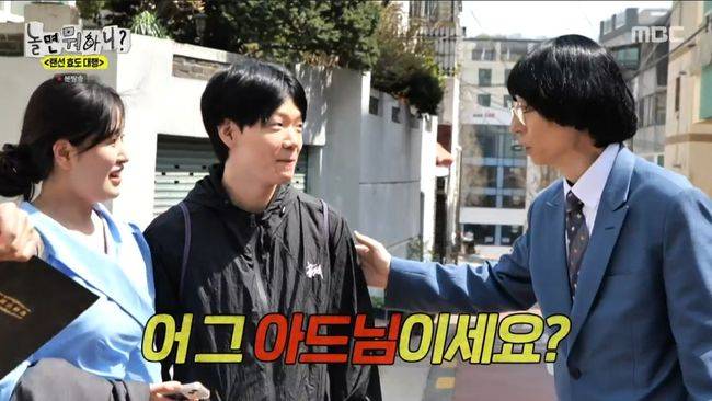 유재석은 여성을 향해 “(옆에 분은)아드님이냐”고 물었다. 이에 여성은 크게 당황하더니 “남자친구”라고 답했다. 이를 지켜보던 하하는 유재석을 길바닥에 넘어뜨리며 “미친 거 아니냐”고 했고, 유재석은 “그렇지 않아도 이상하다고 생각했다. 느낌이 학원 차림”이라며 수습에 나섰다.