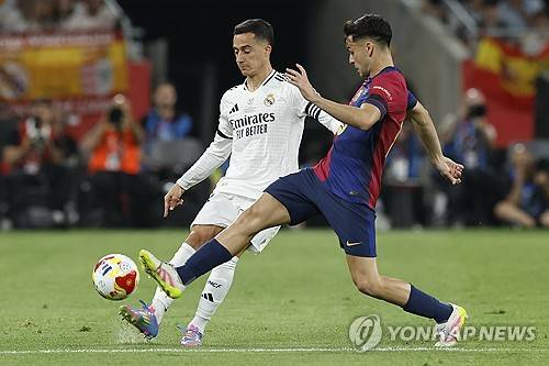 epa12057361 Real Madrid's Lucas Vazquez (L) in action against FC Barcelona's Gerard Martin (R) during the Spanish King's Cup final soccer match between FC Barcelona and Real Madrid, in Seville, Spain, 26 April 2025. EPA/JULIO MUNOZ