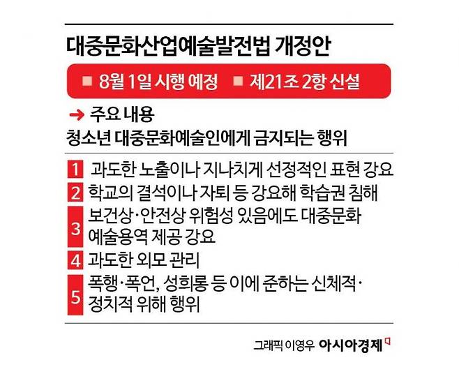 아동·청소년 성 상품화 이슈가 사회적으로 지속적인 논란이 되자 국회는 법안 개정에 나섰다. 올해 1월 대중문화예술산업발전법 일부 개정안이 국회를 통과했다. 법안에 따르면 대중문화예술사업자는 청소년 대중문화예술인과 계약할 때 예술인의 신체적·정신적 건강, 학습권, 인격권, 수면권, 휴식권 등 기본적 인권을 보장하는 조치를 계약에 포함해야 한다. 또한 청소년보호책임자를 지정해야 하며 관련 자료 제출도 해야 한다. 오는 8월부터 시행된다.