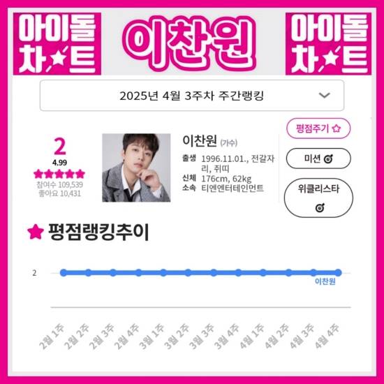 아이돌차트는 최근 이찬원이 2025년 4월 3주 차 평점 랭킹에서 109,539표를 받아 2위에 올랐다고 밝혔다.