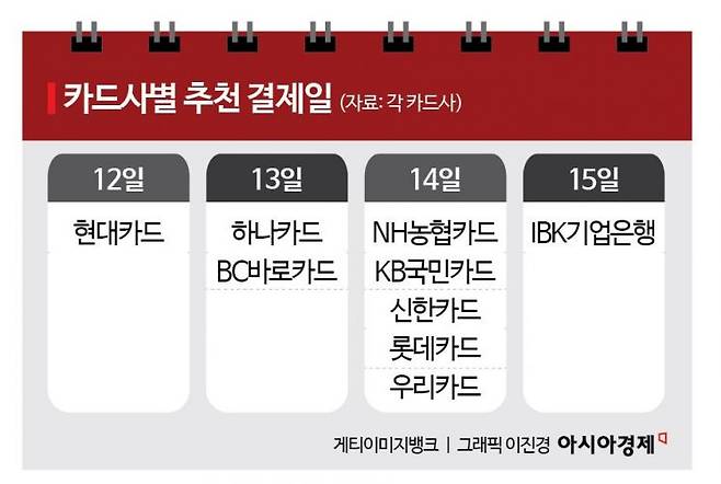 이런 혼란을 줄이기 위해 결제일을 전략적으로 설정하는 것이 중요하다. '전월 1일부터 말일까지' 사용분이 청구되도록 신용카드 결제일을 맞추는 것이 한 달 소비 내역을 효율적으로 관리하기 좋다. 카드사마다 청구 기준에 다소 차이가 있지만, 일반적으로 결제일을 13일부터 15일 사이로 설정하면 전월 한 달간의 사용 금액이 한 번에 청구된다. 구체적으로 ▲현대카드 12일, ▲하나·BC바로카드 13일▲신한·롯데·KB국민·우리·NH농협카드 14일, ▲IBK기업은행 카드 15일을 결제일로 지정하면 전월 1일부터 말일까지의 소비 내역이 그대로 청구서에 반영된다.