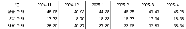 현재의 상승 거래 비중 감소세가 지속될지는 더 지켜봐야 한다는 것이 전문가 분석이다.