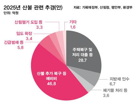 4월22일 국회에 제출된 추가경정예산(추경)안과 산림복구 정책 방향을 보면 이미 현 정부는 이번 산불 확산을 ‘불가항력적인 재해’로 규정했음을 알 수 있다. 추경안을 보면 산불 추가 복구, 여름철 집중호우 대응 등 예비비(1조4천억원)를 비롯해 긴급벌채(1740억원), 임도 확장(1008억원) 등 기존 산림정책을 지지하는 예산이 대거 편성됐다. △재개발식 대규모 벌채와 조림 △임도·사방댐 건설과 같은 토목공사 △장비 도입 등과 같이 앞선 대형산불 때와 똑같은 패턴을 이어가겠다고 예고한 것이다. 주택 복구 및 저리 대출 지원 등은 8600억원이다.