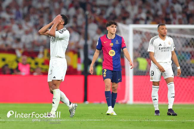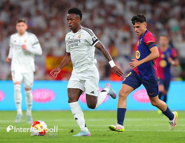 레알은 전반 34분 벨링엄이 골망을 흔들었지만 오프사이드로 판정되면서 취소가 됐다. 전반 43분 코너킥 상황에서 페란이 뒤로 흘린 공은 그대로 빗나갔다. 전반 추가시간 1분 비니시우스가 페널티킥 유도를 하려고 했지만 이전 상황에서 오프사이드로 판정돼 상황이 종료됐다. 전반 추가시간 5분 하피냐 슈팅은 막혔다. 전반은 바르셀로나의 1-0 리드 속 종료됐다.