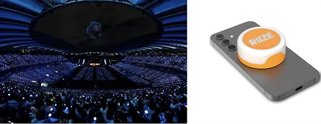 | ▲ 왼쪽부터 드론과 응원봉으로 연출된 아이유 콘서트 ‘THE WINNING’ 현장, 그립톡 형태의 응원 장치 ‘라이트톡’. |