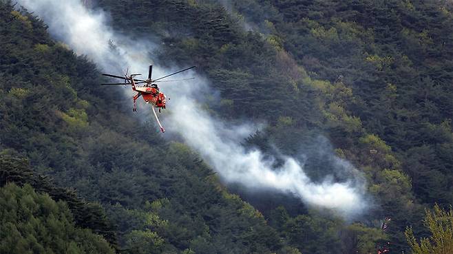 ▲ 27일 강원 인제군 상남면 하남리 인근 야산에서 산불 진화 헬기가 분주하게 진화 작업을 펼치고 있다.