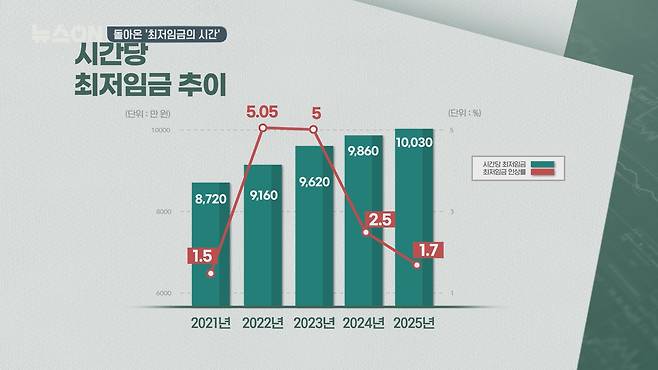 최근 5년간 최저임금과 인상률을 살펴보면요. 2021년 8,720원으로 전년 대비 1.5%, 2022년 9천 160원으로 5.05%, 2023년 9천 620원으로 5%, 2024년 9천 860원으로 2.5%, 2025년 만 30원 1.5% 인상입니다. 소득주도 성장, 최저임금 만 원을 공략했던 문재인 정부 초반에는 2018년에는 16.4%, 2019년에는 10.9%로 노무현 정부 이후 인상 폭을 높였으나 코로나 등의 여파로 인상 폭이 주춤했고요. 윤석열 정부는 2.5%, 1.7% 인상 폭을 보였습니다.