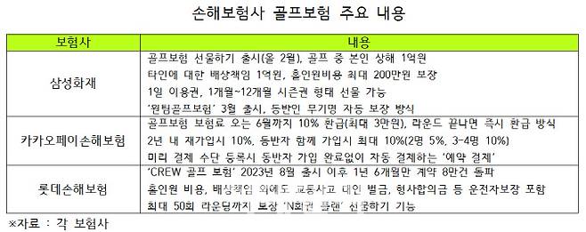본격적인 골프시즌을 맞아 손해보험업계 1위인 삼성화재가 골프보험 선물하기와 동반형 골프보험 등을 연이어 출시하며 시장 확대에 나섰다.