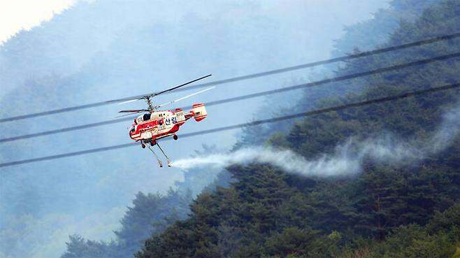 ▲ 지난 26일 강원 인제에서 진화 헬기가 산불 진화 작업을 벌이고 있다.