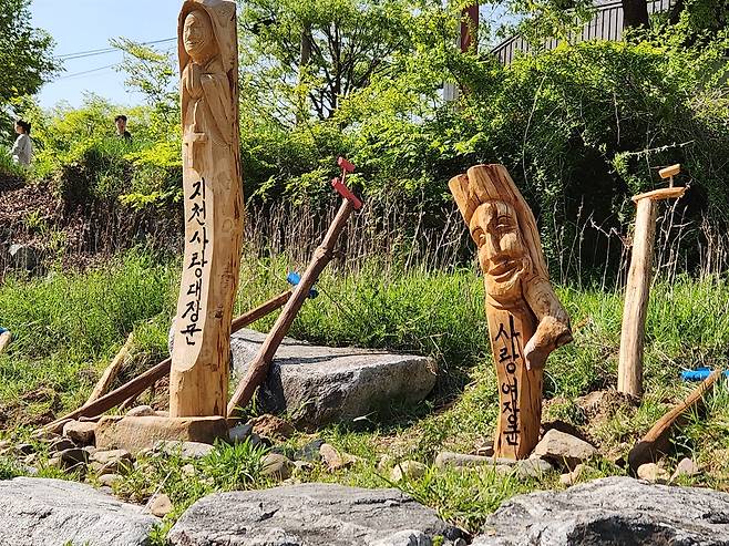 충남 청양에서도 가장 아름다운 곳 중 하나로 꼽히는 칠갑산 까치내 유원지에는 최근 장승이 세워졌다.