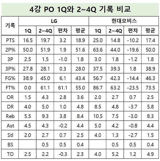 현대모비스는 안양 정관장과 6강 플레이오프에서 1쿼터 평균 23.7점을 기록했다. 정관장보다 수비가 더 좋은 LG를 상대로 1쿼터에서는 더 많은 득점을 올린 현대모비스는 나머지 2,3,4쿼터에서 20점 이상 올린 적이 한 번도 없다.