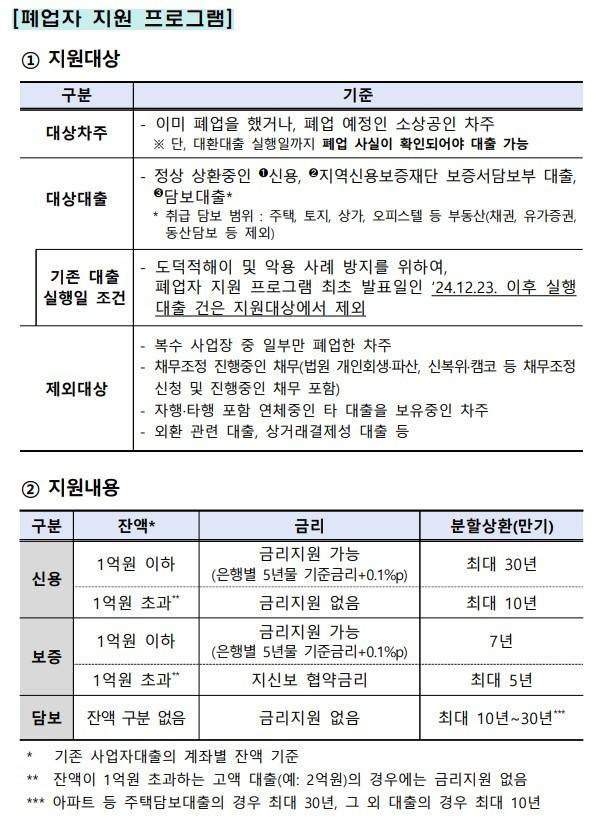 이번 지원 방안 발표일인 지난해 12월 23일 이전에 받은 대출에 한해, 폐업 예정이거나 이미 폐업한 소상공인이 정상 상환 중인 개인사업자 대출(신용·지역신용보증재단보증·부동산담보)은 혜택을 받을 수 있는 대상자가 됩니다.