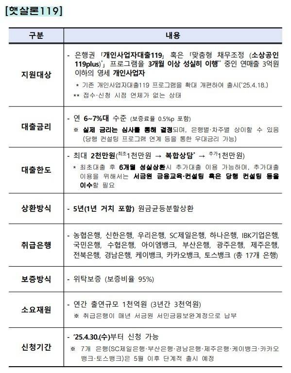 햇살론119는 앞서 이번 달 18일부터 시행 중인 '맞춤형 채무조정'(소상공인119plus)와 연계된 상품입니다.