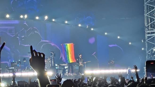 | ▲ 콜드플레이의 프론트맨 크리스 마틴은 'People Of The Pride'를 부르던 도중 '프라이드 플래그'를 꺼내 들었다. |