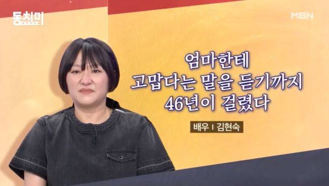 지난 26일 방송된 MBN 예능 '속풀이쇼 동치미(약칭 동치미)'에서는 김현숙이 게스트로 출연했다. 그는 '엄마한테 고맙다는 말을 듣기까지 46년이 걸렸다'라며 에피소드를 풀어냈다.