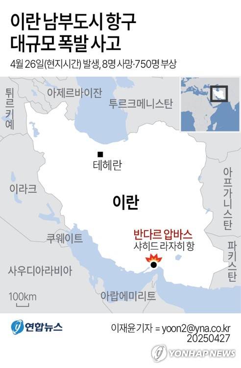 (서울=연합뉴스) 이재윤 기자 = 26일(현지시간) 낮 이란 남부 도시 반다르 압바스의 항구에서 대규모 폭발이 발생해 8명이 숨지고 750명이 다쳤다고 로이터, AP 통신 등 외신이 보도했다. 항구 직원 규모를 고려하면 인명 피해는 상당히 클 것으로 예상된다.