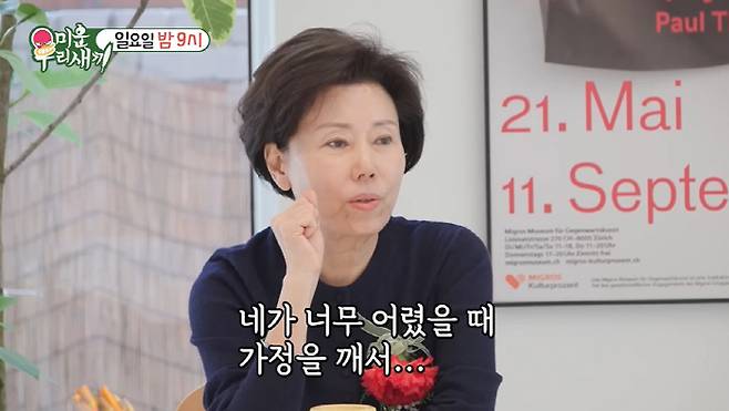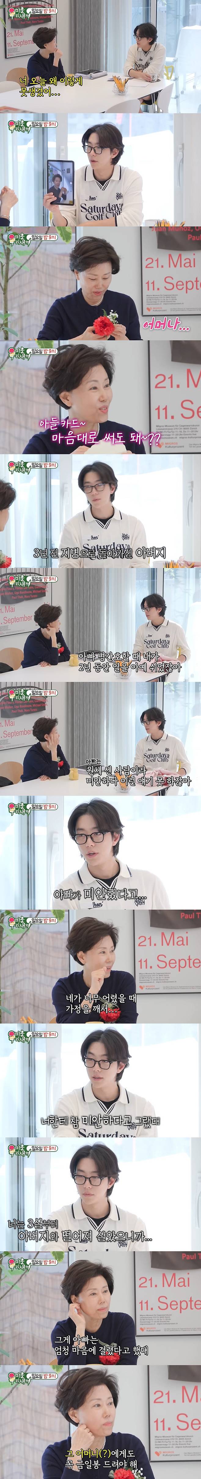어머니는 "아빠가 예전에 미국에 간 적이 있는데 그때 아빠가 이모한테 네가 너무 어렸을 때 가정을 깨서 너한테 참 미안하다고 그랬다더라"며 "이혼할 때 형은 9살이니까 아빠랑 캠핑 다녔던 거 기억할텐데 너는 3살이었으니까 기억 못하지 않나. 그게 아빠는 엄청 마음에 걸렸다고 하더라"고 말했다. 그러면서 "그래서 네가 애틋하다고 했다더라. 그런 마음이 있으니까 아빠가 그런 마음이 더 강했을 것 같다"고 했다.