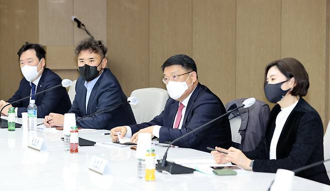 | ▲ 2023년 2월 18일, 서울 중구 대한상공회의소에서 열린 '디스플레이 기업 간담회'에 참석한 김희연 당시 LG디스플레이 CSO(오른쪽부터), 김성일 동진쎄미켐 사장, 이동욱 한국디스플레이산업협회 부회장, 신희동 한국전자기술연구원장이 장영진 산업통상자원부 제1차관의 인사말을 듣고 있다. |
