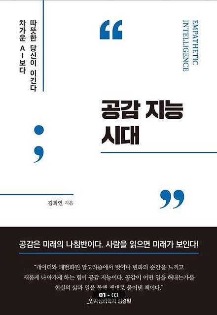 세미콜론(; 쌍반점) 옆에 따옴표. 책 표지 문장 부호들이 오히려 호기심을 자극했다. 세미콜론은 일반적으로 앞서 문장에 이어 인과관계 등에 대한 설명을 계속하려고 할 때 쓴다. 세미콜론 위에는 "차가운 AI보다 따뜻한 당신이 이긴다"는 서술, 그리고 따옴표 안에 책 제목 '공감 지능 시대'가 자리하고 있다.