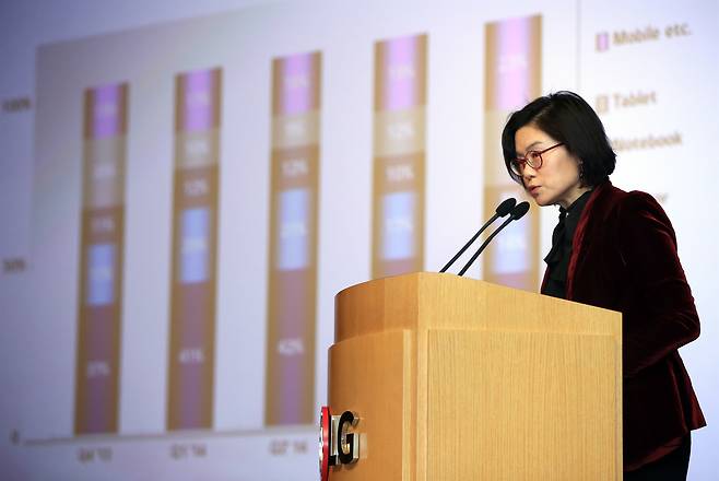 | ▲ 2015년 1월 28일, 당시 LG디스플레이 IR담당 김희연 상무가 서울 여의도 LG트윈타워에서 LG디스플레이 2014년 4분기 실적 설명회에서 실적 내용을 설명하고 있다. |