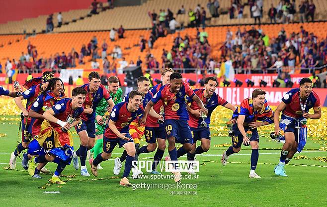 바르셀로나는 27일(이하 한국시간) 스페인 세비야의 에스타디오 올림피코 데 라 카르투하에서 열린 레알 마드리드와 2024-25시즌 코파 델 레이(국왕컵) 결승에서 2-2로 팽팽하던 연장 후반 11분 터진 쥘 쿤데의 결승골을 앞세워 3-2로 승리했다.
