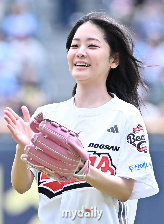 배우 정수빈이 시구를 마친뒤 박수를 치고 있다.