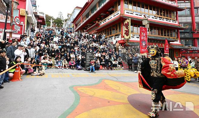 [인천=뉴시스] 전진환 기자 = 완연한 봄 날씨를 보인 27일 인천 중구 차이나타운을 찾은 시민들이 차이나타운 문화공연인 변검 공연을 관람하고 있다.2025.04.27. amin2@newsis.com