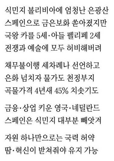 제국이 무너진 건 역설적으로 모두가 축복이라고 했던 은광의 발견이었습니다. 은광과 금을 발견하지 않았다면, 어쩌면 스페인은 제법 괜찮은 역사를 썼을지도 모르겠습니다. 스페인판 '자원의 저주'였습니다.