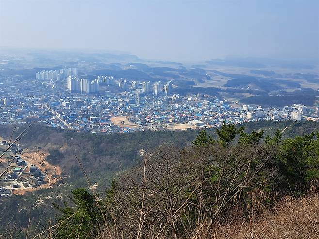 | ▲ 태안읍 백화산 정상에서 본 태안읍과 남면 방향. 사진 가운데, 누런 흙이 드러난 곳이 태안읍성이다. |