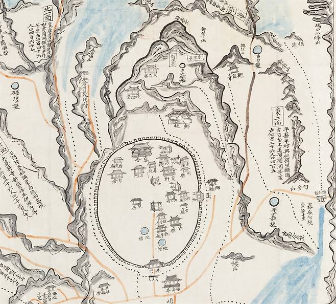 | ▲ 태안읍성(1872년지방지도_부분) 태안읍성의 성곽과 주요 시설 및 남문 앞 경이정이 그려져 있다. 뒤 백화산엔 '고산성지'라고 씌여 있다. |