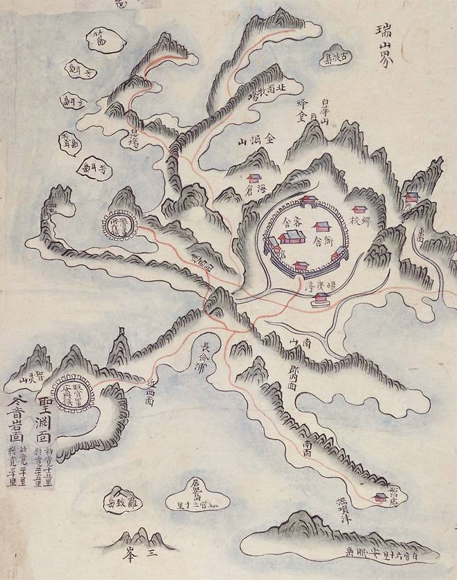 | ▲ 태안(해동지도) 태안읍성이 강조된 해동지도. 편 손바닥 모양의 태안반도가 잘 그려져 있다. 태안읍성-안흥진성-소근진성으로 이어진 방어체계가 한 눈에 보인다. |