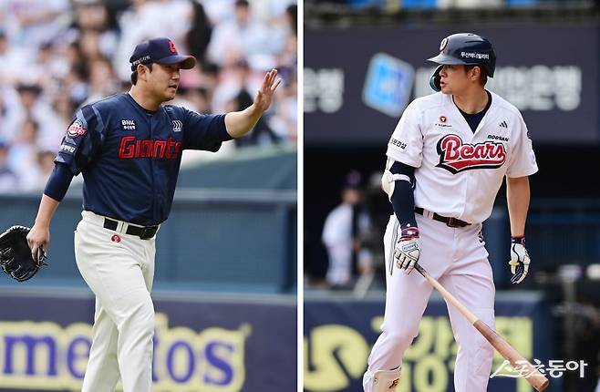 27일 서울 잠실야구장에서 열린 ‘2025 신한 SOL Bank KBO리그’ 롯데 자이언츠와 두산 베어스의 경기에서 6회말 2사 2루 상황에서 두산 김재환이 김상수의 투구에 맞은 후 화를 내고 있다. 김상수는 이닝 종료 후 김재환에게 손짓하며 사과하고 있다. 잠실 | 주현희 기자 teth1147@donga.com