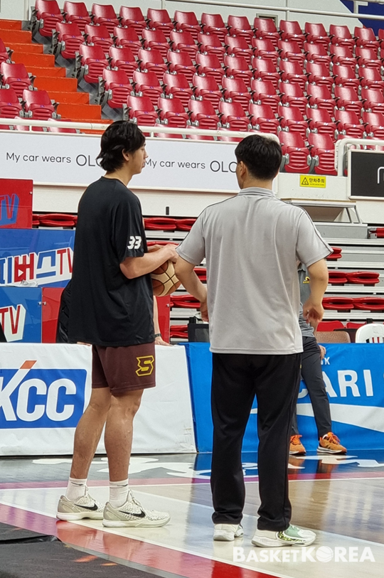 한편, 조상현 LG 감독은 여러 선수들과 이야기를 나눴다. 1옵션 외국 선수인 아셈 마레이(202cm, C)와는 밝은 표정으로 대화를 했다. 타마요와도 마찬가지였다.
