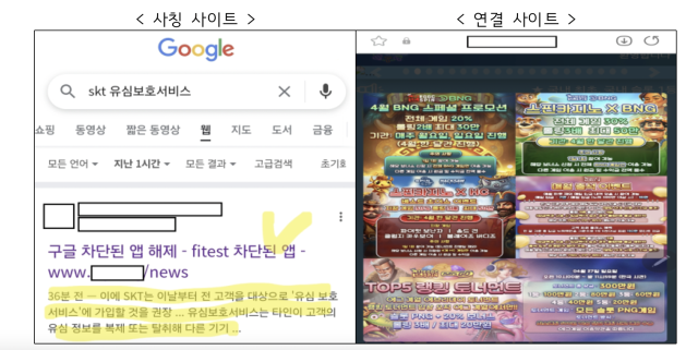 당국이 발견한 사례는 인터넷 사이트 검색 엔진에 ‘유심무상교체’ ‘유심보호서비스’ 등 관련 키워드를 입력하면 언론 보도 일부를 발췌·삽입한 검색 결과가 노출되고, 검색 결과 클릭시 중간 경유용 비영리 도메인을 경유해 최종적으로 도박 사이트로 연결되는 방식이다. 관계자는 “피해 예방을 위해 검색 결과에 노출되는 사이트의 주소가 정상 사이트와 일치하는지 확인하고, 출처가 불분명한 사이트 접속은 자제하는 주의가 필요하다”며 “만일 피싱 사이트로 접속했다면 절대로 사용자 정보를 입력하거나, 악성앱 등을 설치해서는 안 된다”고 말했다. 또한 “과기정통부와 KISA는 유심 무상 교체 등을 사칭한 피싱·스미싱 공격이 지속될 것으로 예상됨에 따라 유사한 피싱 사이트를 신속하게 탐지하여 차단 중이며, 집중 모니터링을 강화하는 등 유사시 사고 대응을 위한 대비에 만전을 기하고 있다”고 밝혔다.