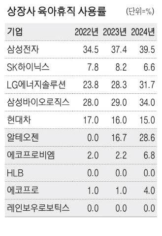 코스닥 기업 중에서는 시가총액 1위 알테오젠이 2022년 0.0%에서 2024년 28.6%로 육아휴직 사용률이 매우 큰 폭으로 개선됐다. 반면 에코프로비엠은 2.0%에서 6.8%, 에코프로는 1.0%에서 4.0%로 개선되고 있으나 여전히 낮은 육아휴직 사용률을 보였다. 특히 HLB와 레인보우로보틱스는 둘 다 3년 내내 육아휴직 사용률이 0%였다.