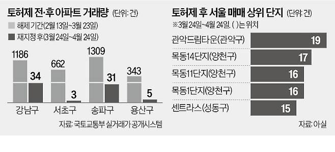 27일 국토교통부 실거래가 공개시스템에 따르면 지난달 24일 토지거래허가제 적용 이후 강남 3구와 용산구 아파트 거래가 끊겼다. 강남구는 토지거래허가제가 풀린 기간(2월 13일~3월 23일)에 1186건이 거래됐지만, 토지거래허가제 적용(3월 24일~4월 24일) 후 34건에 그쳤다. 같은 기간 서초(662건→3건), 송파(1309건→31건), 용산(343건→5건)도 급감했다. 2년 실거주 의무로 갭투자(전세 끼고 투자)가 막히자 강남권 고가 아파트를 살 여력이 떨어진 것이다. 양천(489건→271건), 마포(661건→220건), 영등포(666건→212건), 강동(743건→201건) 등에선 200여 건의 거래가 이어졌다.