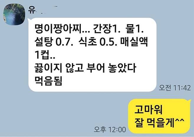 "알았어. 내가 여러 번 담가 보고 알게 된 황금 비율 톡으로 보내줄게."