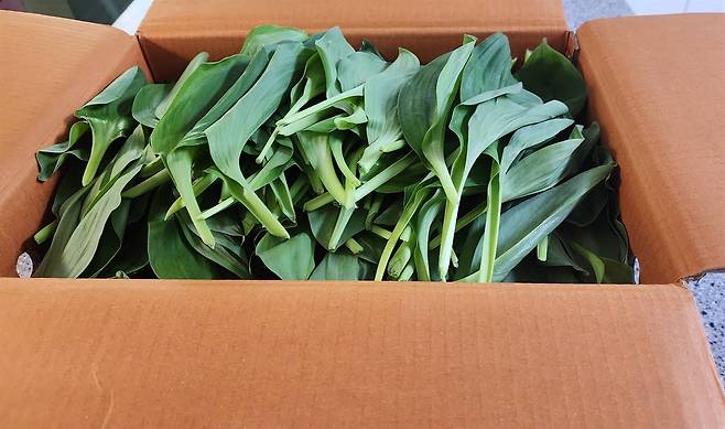 | ▲ 동생이 보내준 명이나물 한 상자 가득 꾹꾹 눌러 많이도 보내주었다. |