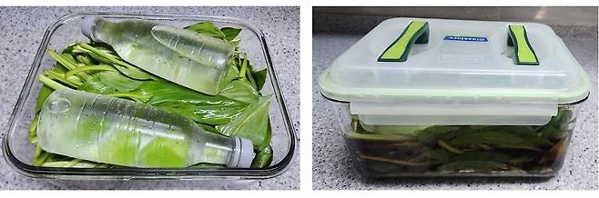| ▲ 명이나물 장아찌 만들기 글라스락 큰 통에 명이나물을 차곡차곡 담고 간장을 부어주었다. |